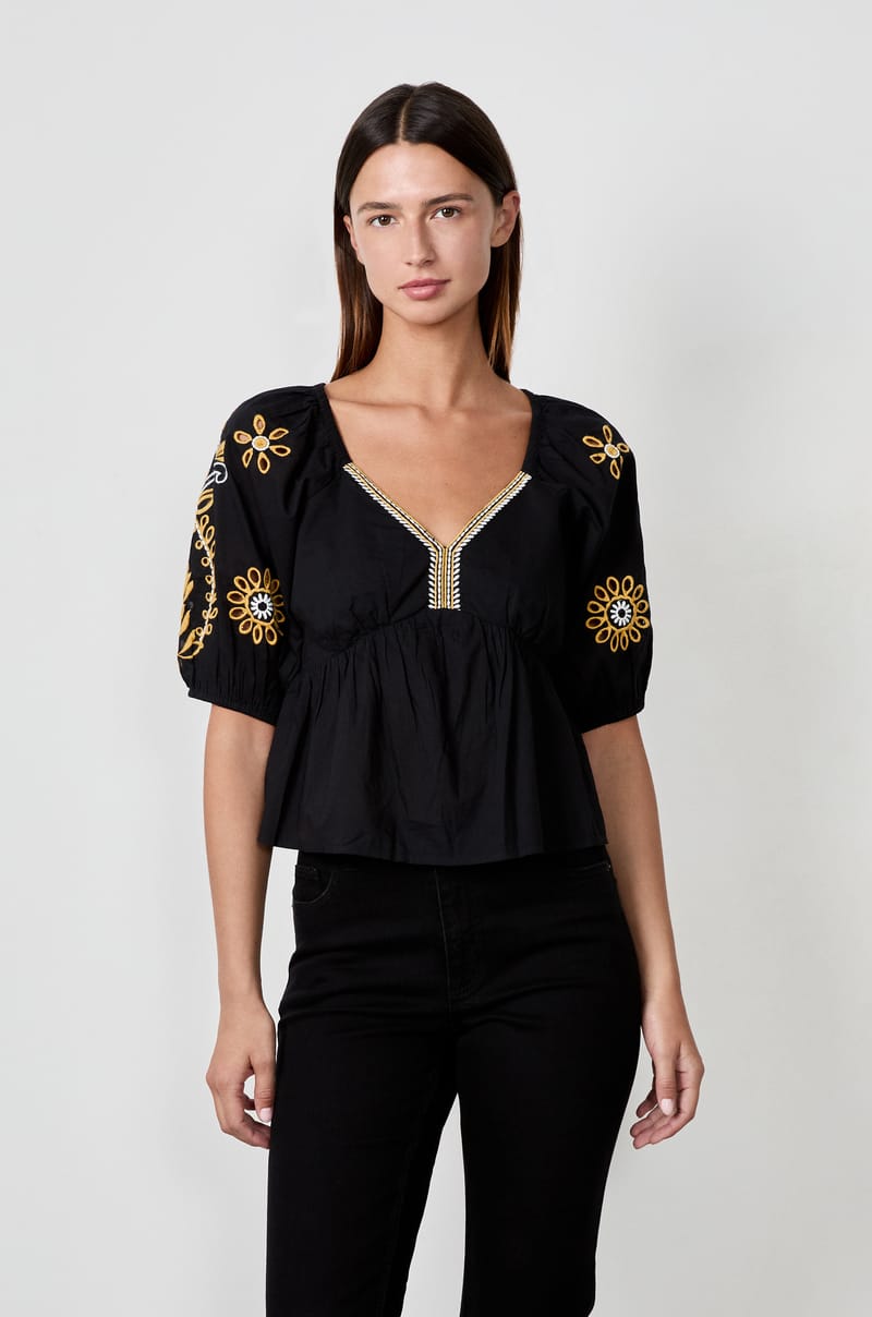 Les broderies sont de mises pour cette saison estivale. Doté d'un col en V et de manches bouffantes, cette blouse i...