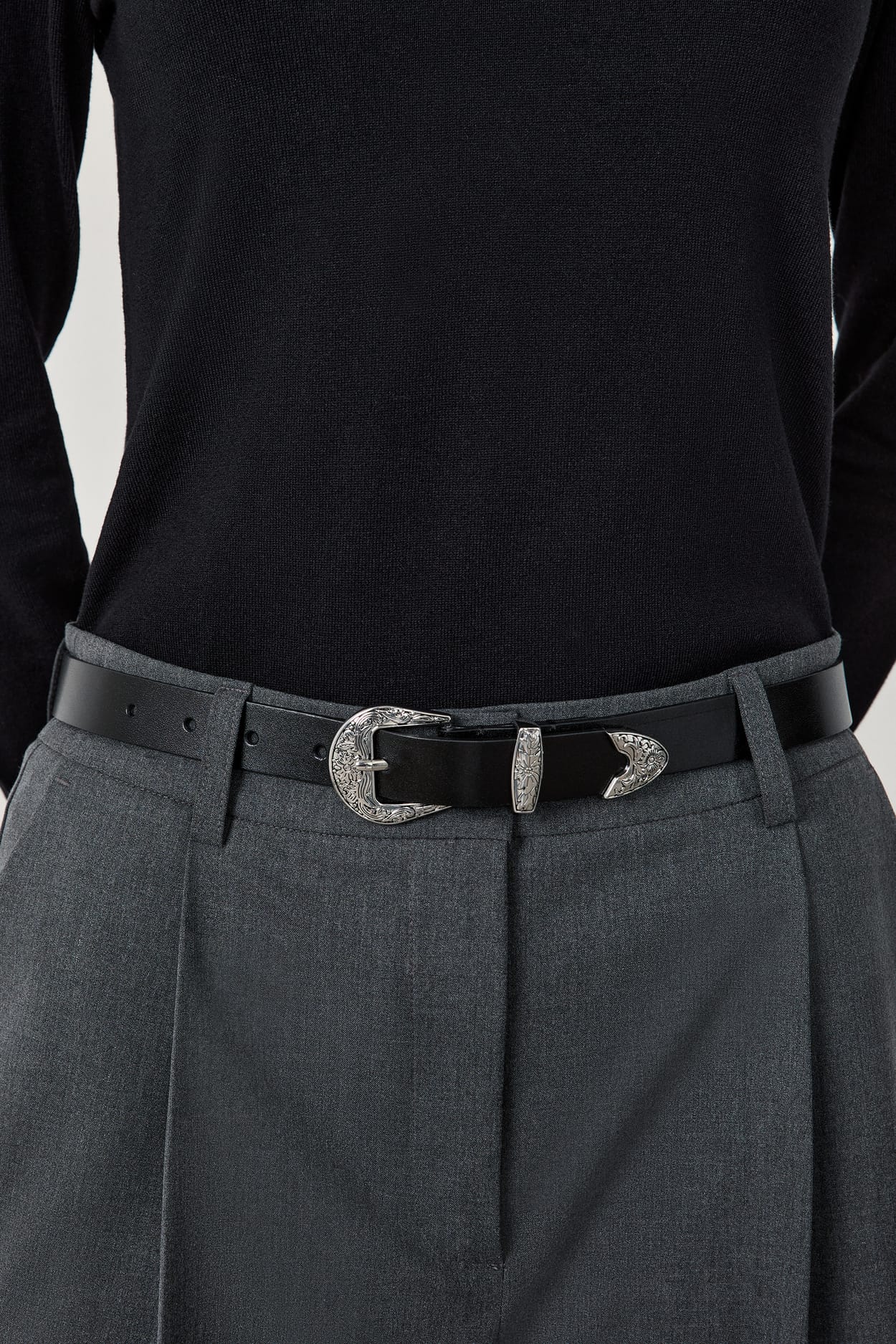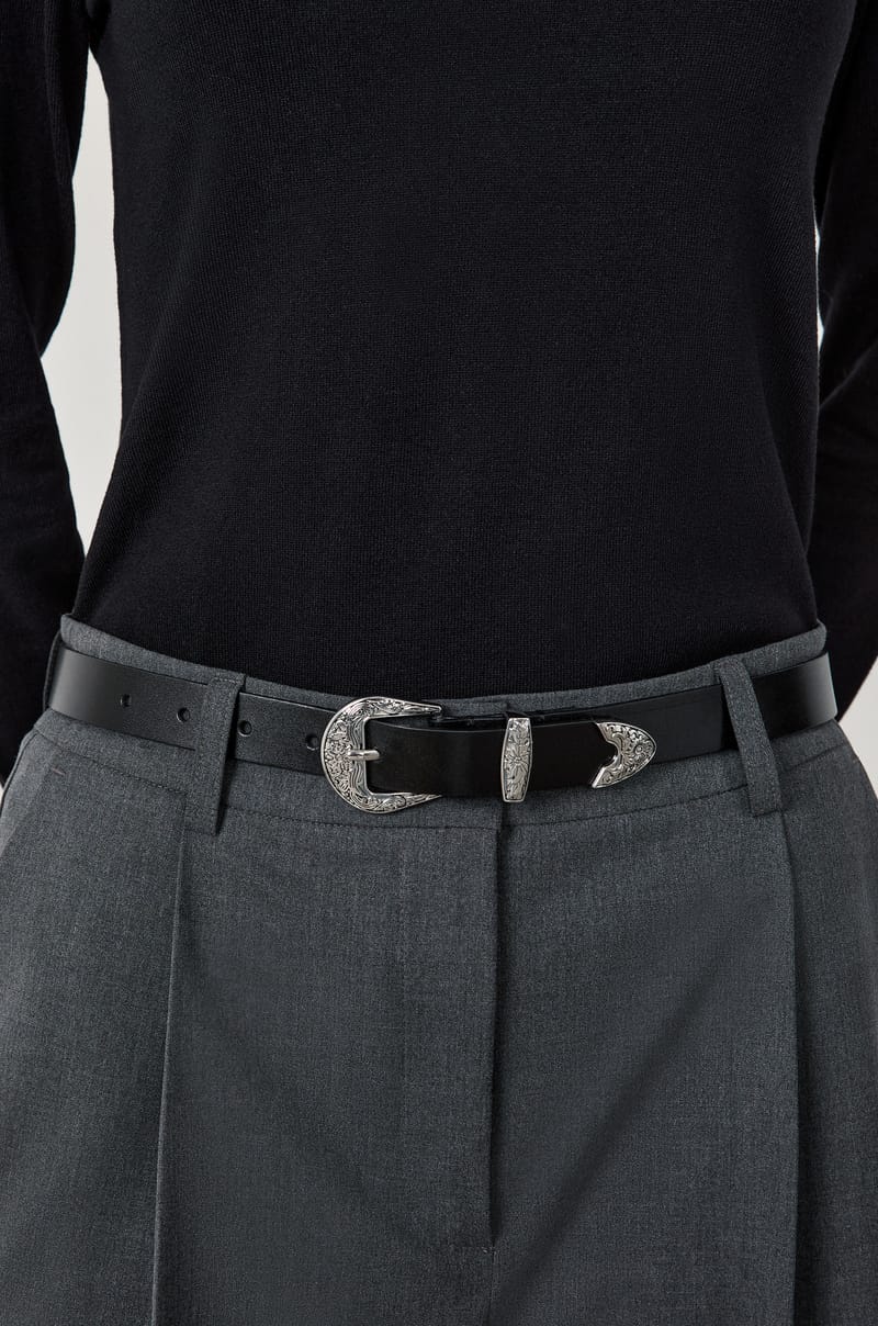 Accessoire indispensable du vestiaire, cette ceinture en cuir noir lisse est munie d'une boucle style western en mé...