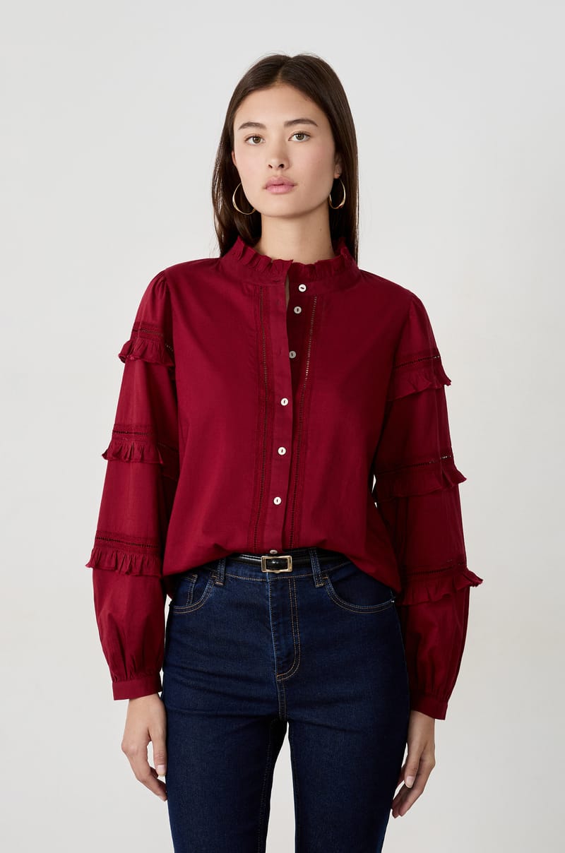 Subtile et raffinée, cette chemise manches longues au col rond s'orne de volants délicats, repris sur les manches e...