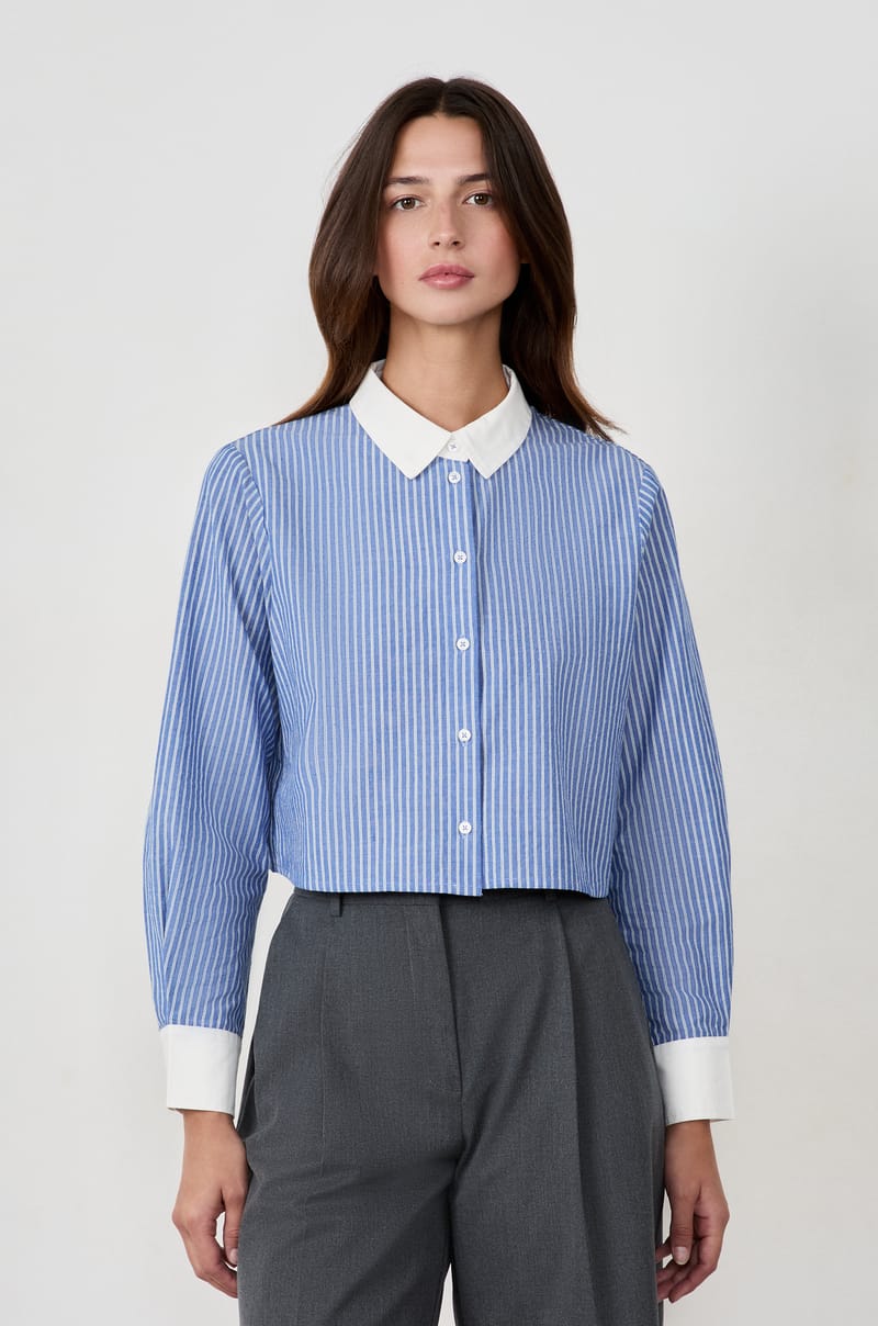 Un basique revisité : cette chemise courte à rayures est munie de manches longues et d'une fermeture boutonnée. Ell...