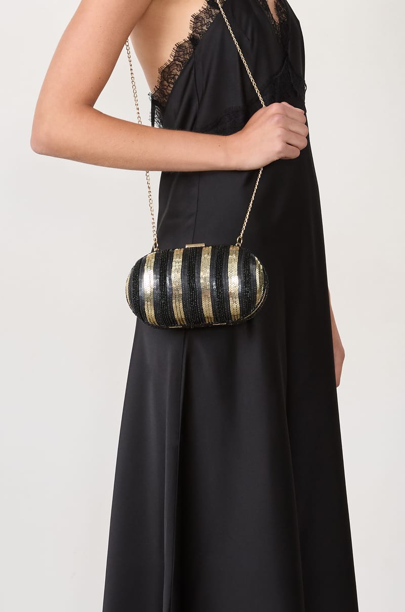 Glitter et lumière. À porter avec une chaîne métallique dorée, ce sac-pochette orné de paillettes capte tous les regards...