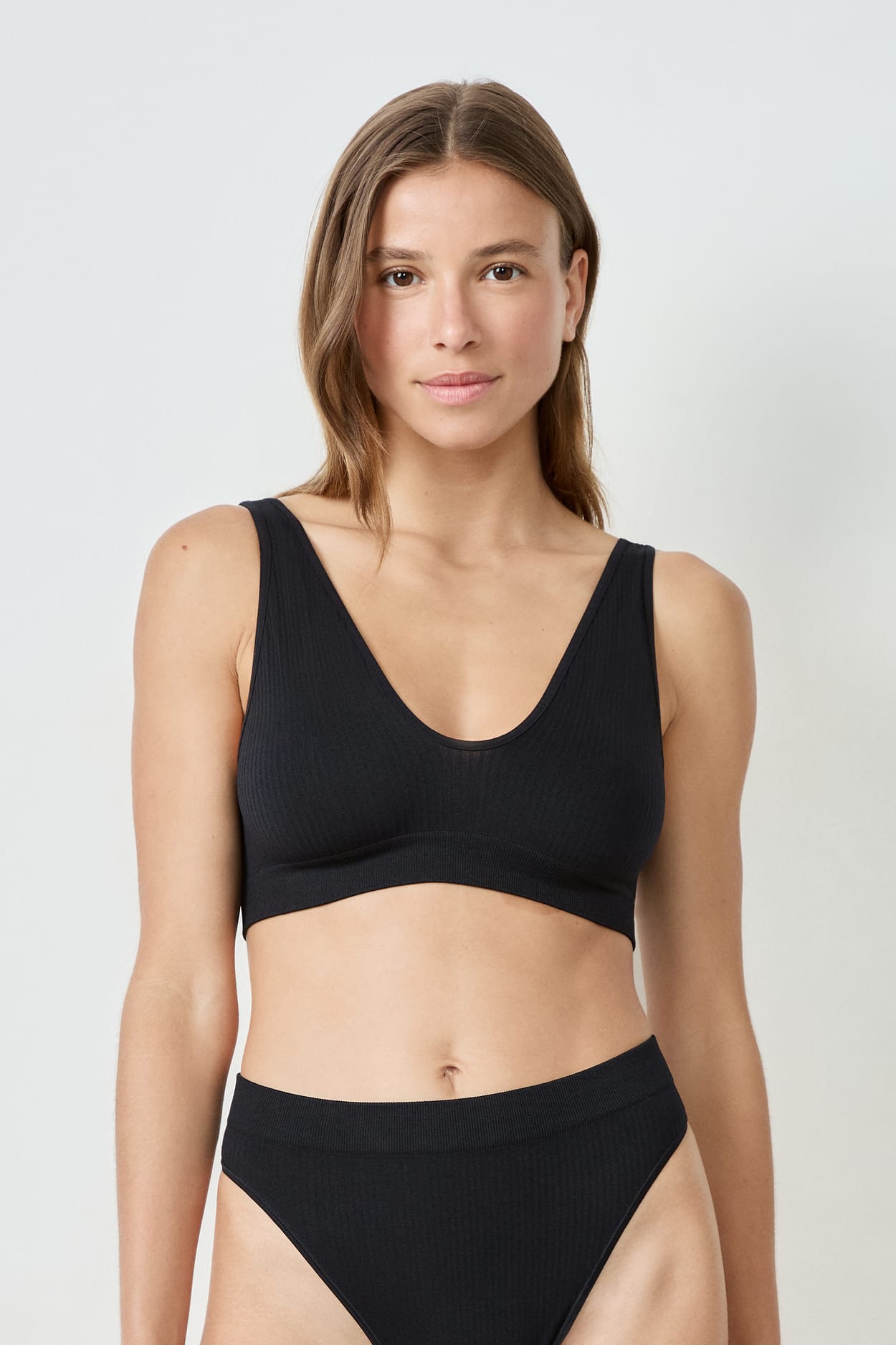 Sans couture, cette brassière côtelée repense le confort au quotidien. Il dévoile un décolleté plongeant ainsi qu'u...