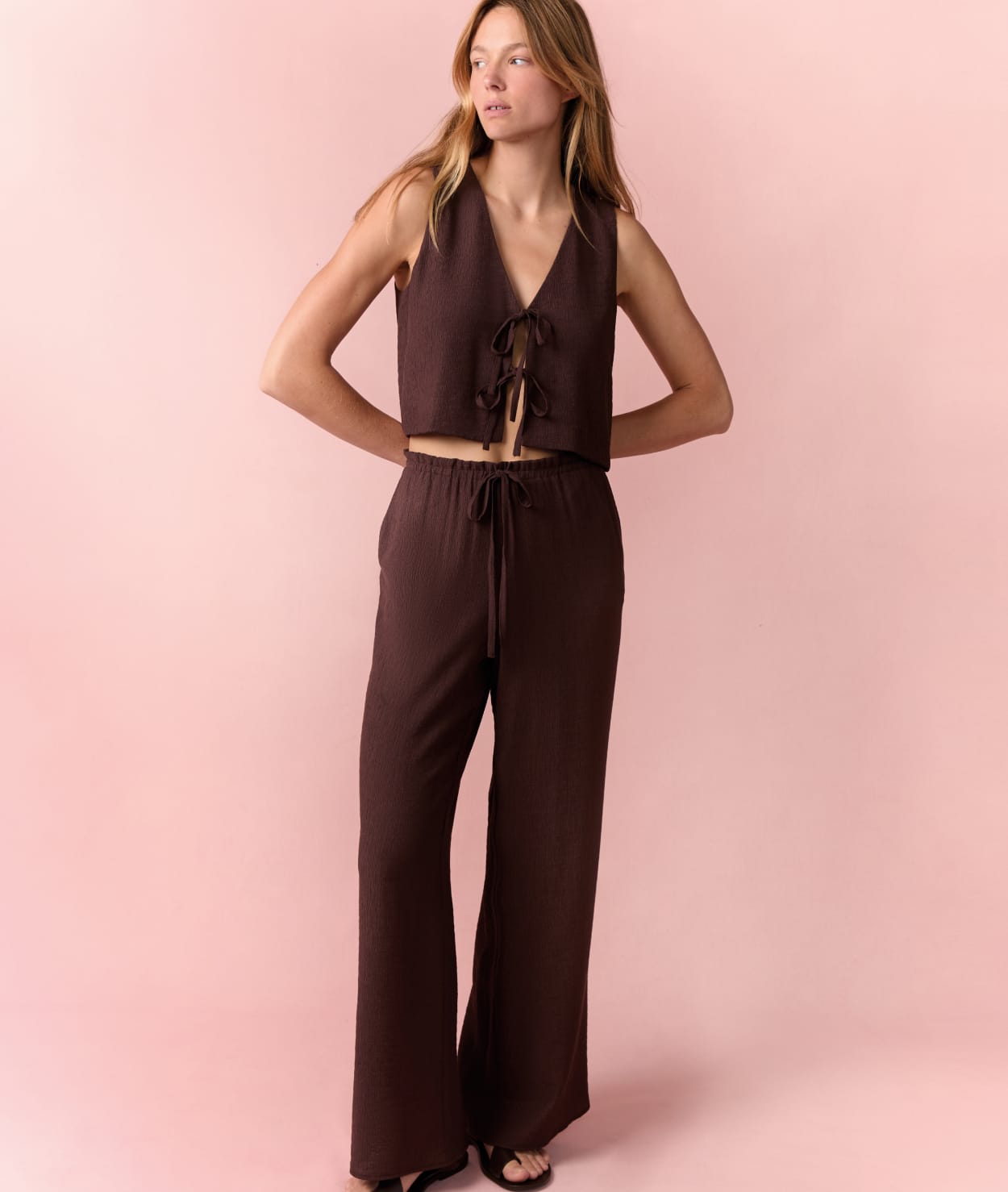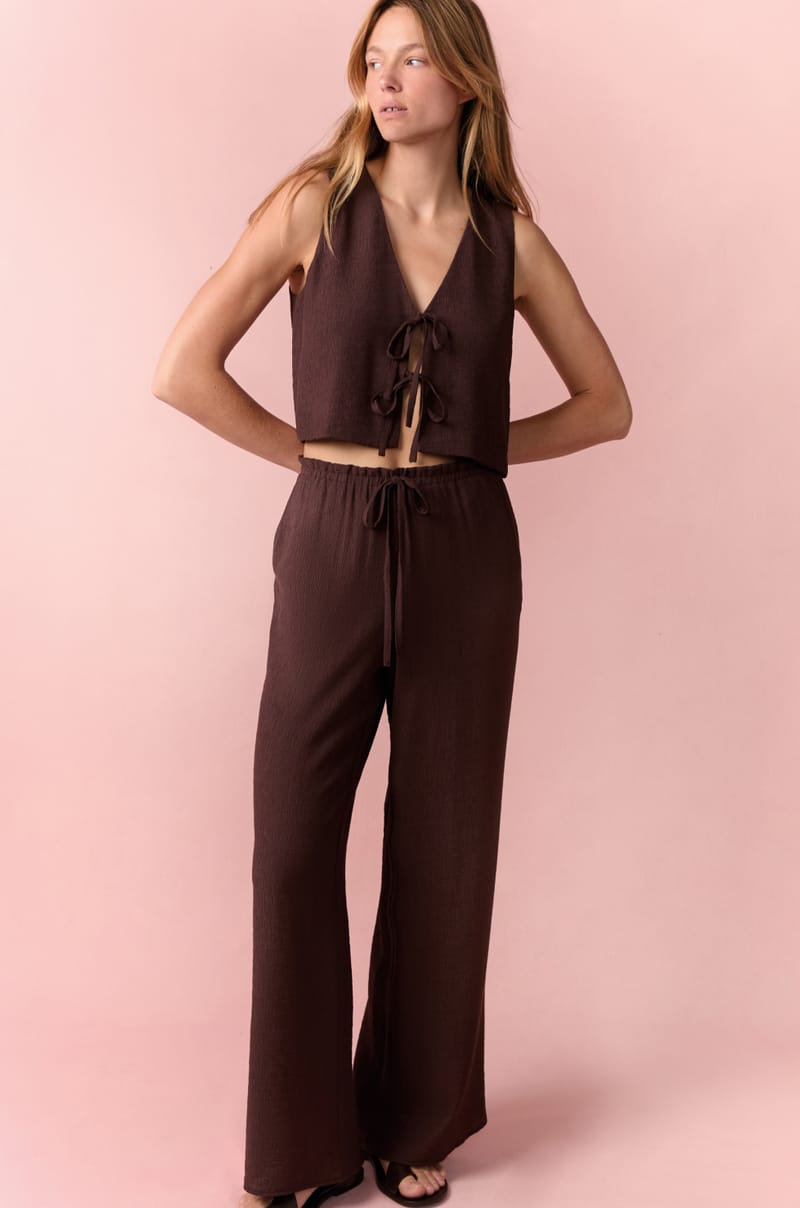 Léger et fluide, ce top sans manches façon gilet se ferme par deux nœuds délicats au milieu. C'est la pièces parfai...