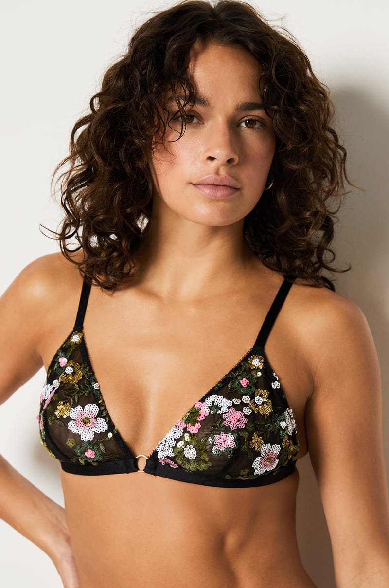 Des broderies spectaculaires se révèlent sur cette lingerie délicate et sensuelle. Des sequins colorés dessinent des fleurs contrastées sur un tulle noir intense, révélant un subtil jeu de transparence avec la peau.