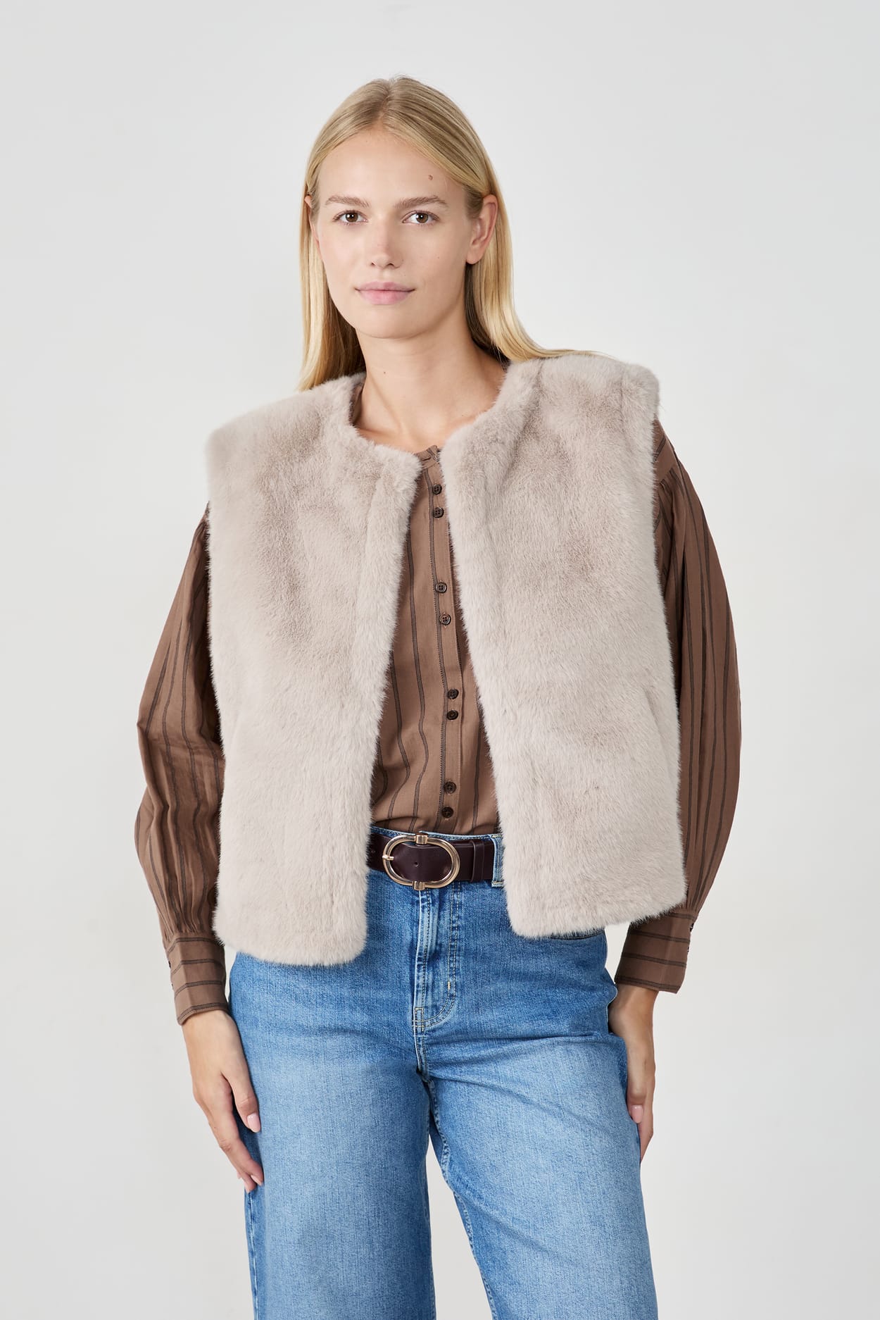 Alternative chic au manteau, cette veste sans manches en fausse fourrure s'associe facilement. Elle se porte en sup...