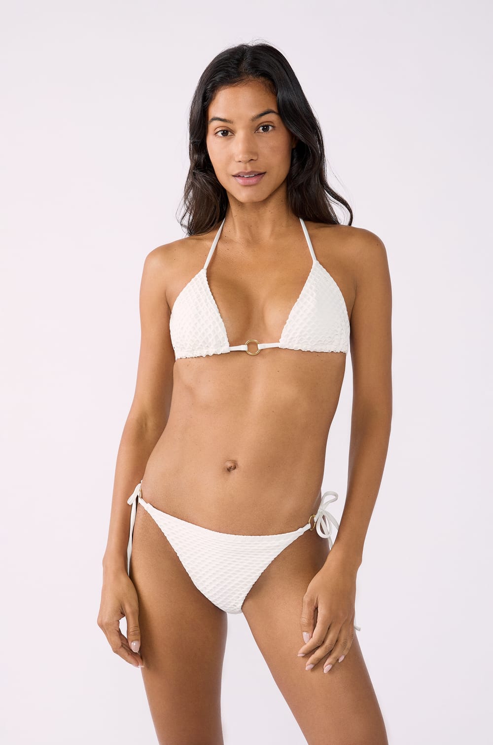 Ponctuée d’anneaux dorés, cette culotte bikini se réinvente avec une doublure travaillée. À associer avec ses hauts asso...