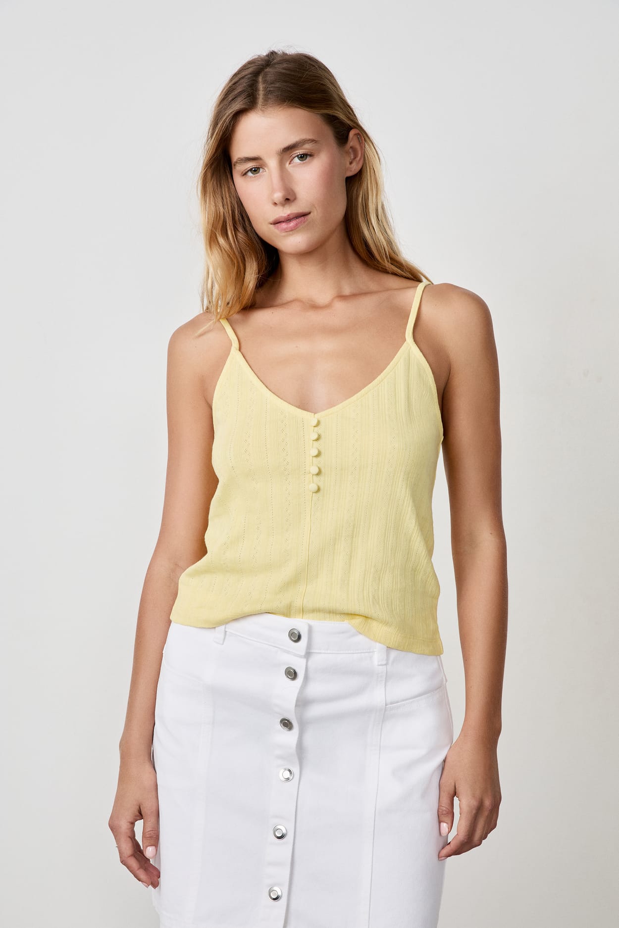 Muni d’une fine bretelle ajustable, de quatre rangées de boutons sur le devant et d’un col en V, le débardeur en pointel...