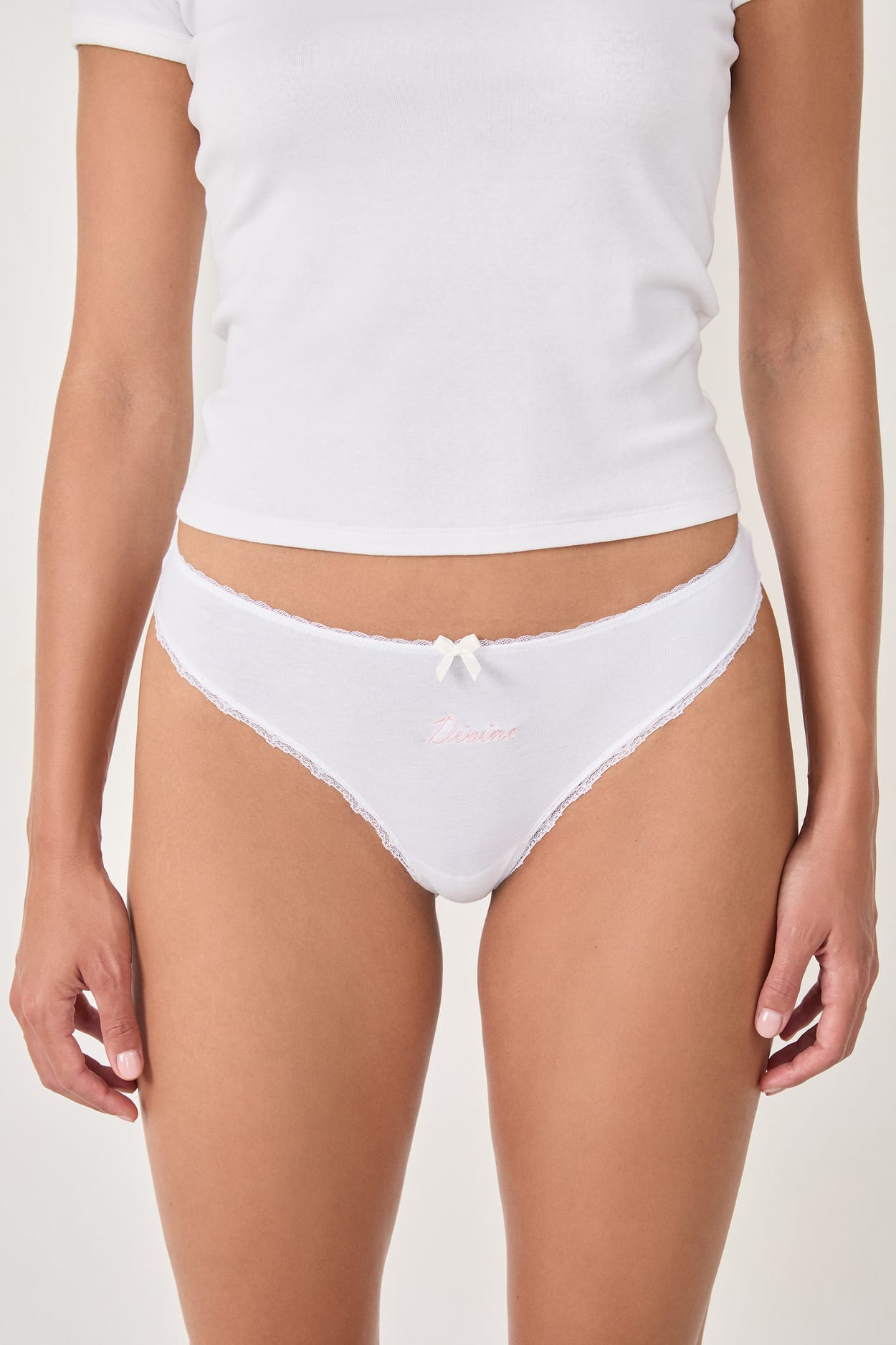 Orné d'une dentelle délicate tout autour, ce tanga est sublimé par une broderie et un petit nœud à l'avant. Co...