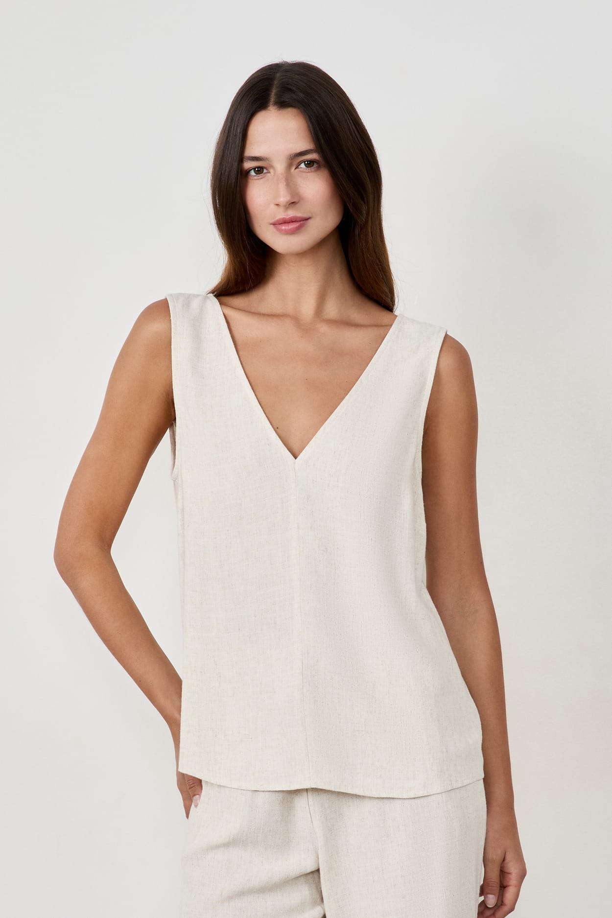Ce top sans manches en lin est muni d'un col V à l’avant et un décolleté en V dans le dos pour une double élégance...