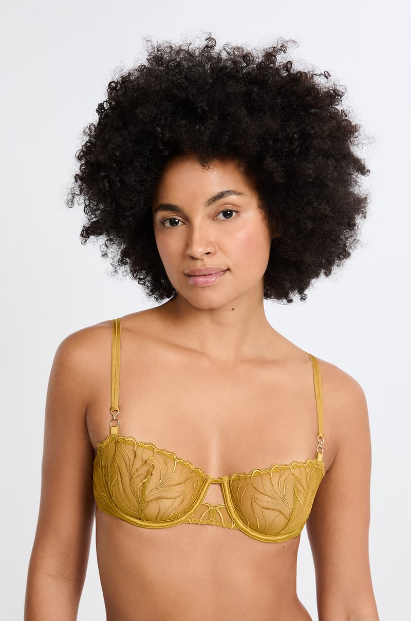 Ce soutien-gorge balconnet opte pour de délicates broderies et un bord festonné légèrement pailleté. Muni d'armatures, il assure un maintien parfait et est réhaussé par un double anneau à la bretelle.