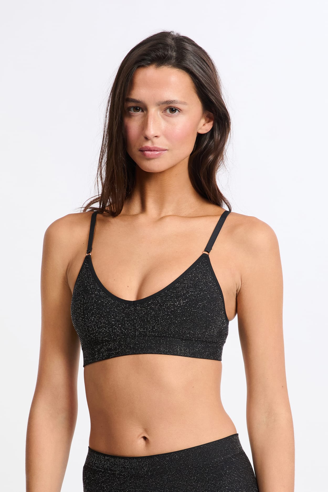 Een bralette met glitters, gebreid zonder naden en zonder beugel voor optimaal comfort en grote bewegingsvrijheid.