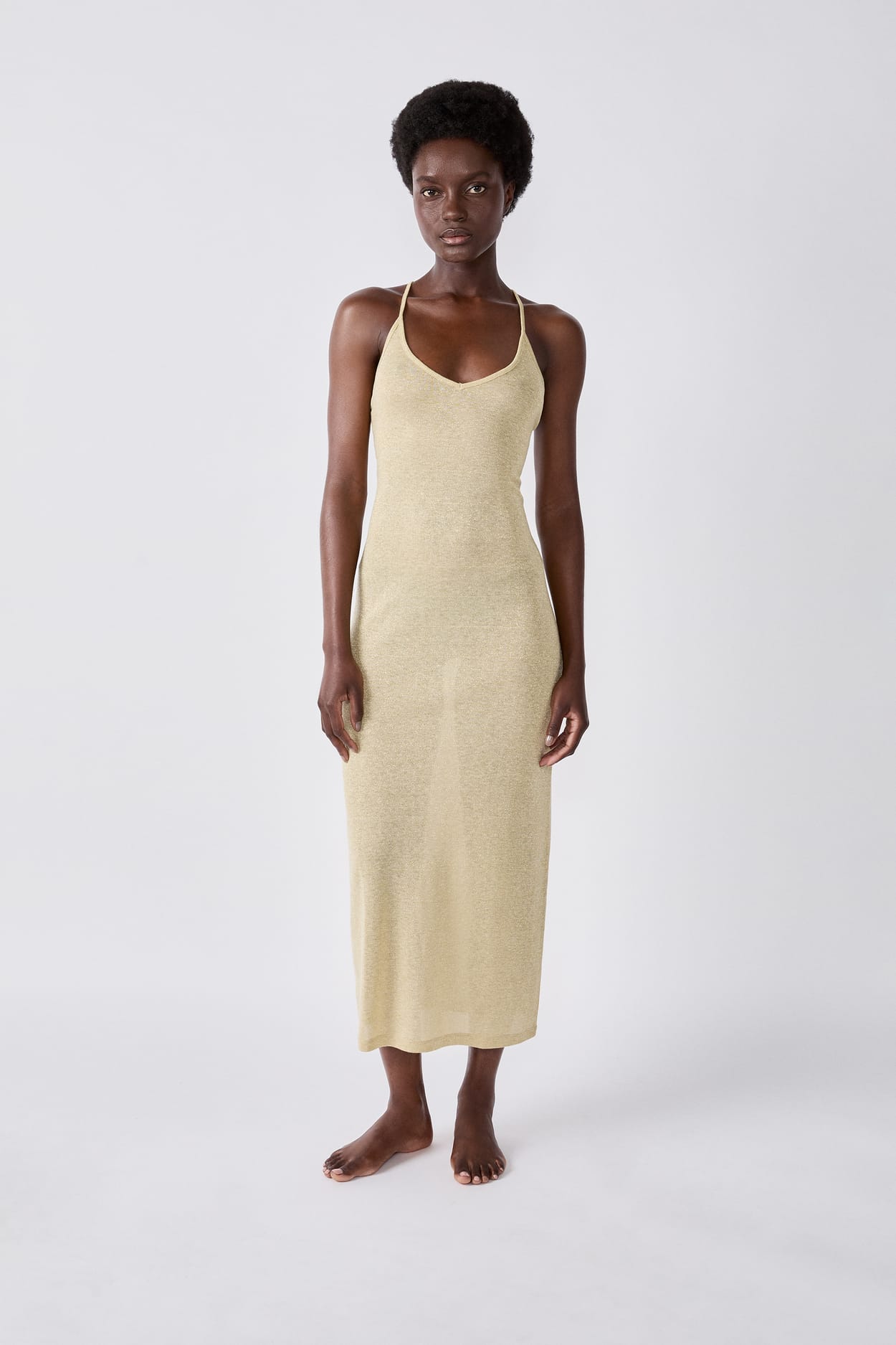 Bezaaid met gemetalliseerde vezels wordt de jurk iriserend en schittert in het daglicht. De V-hals onthult een diep decolleté.