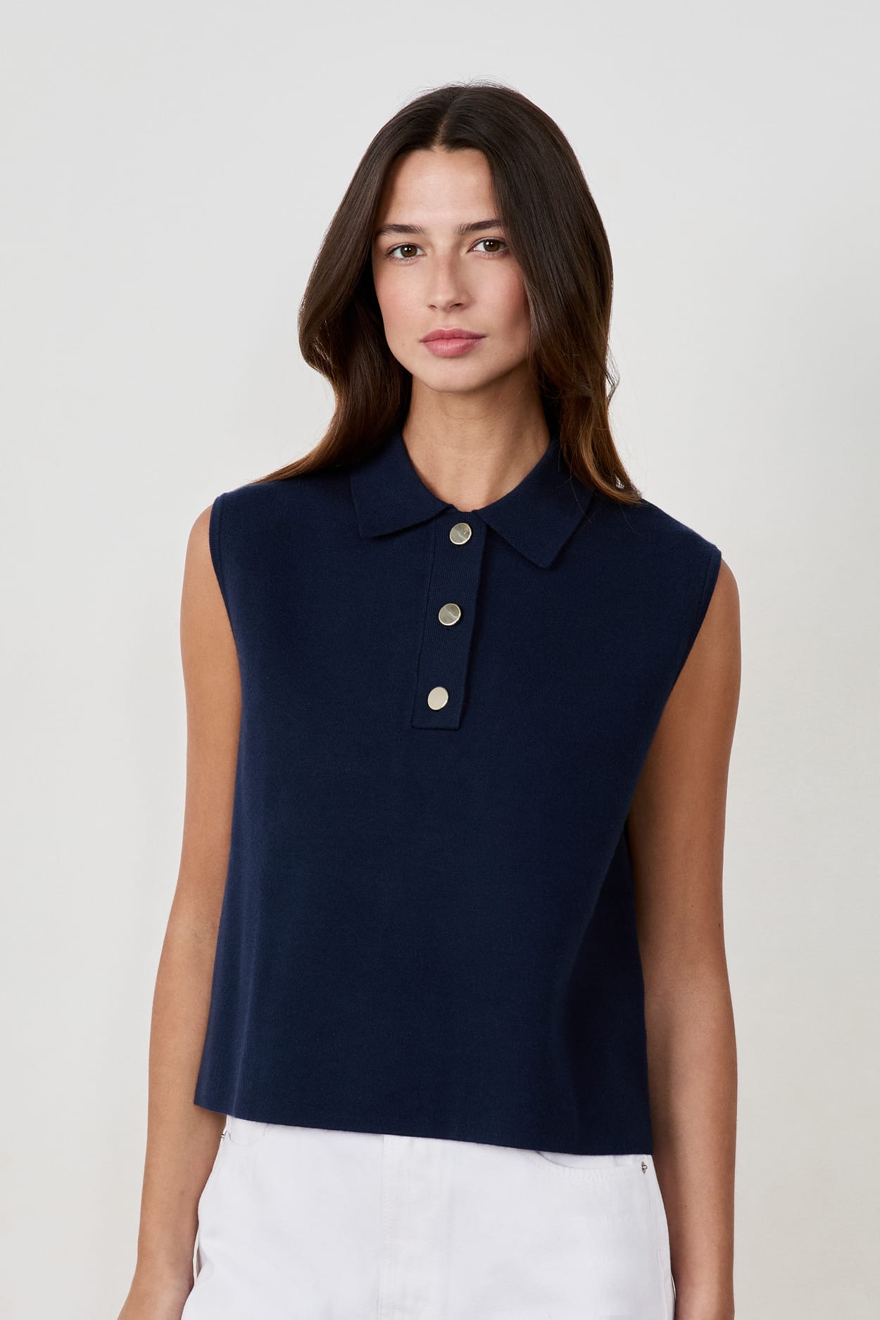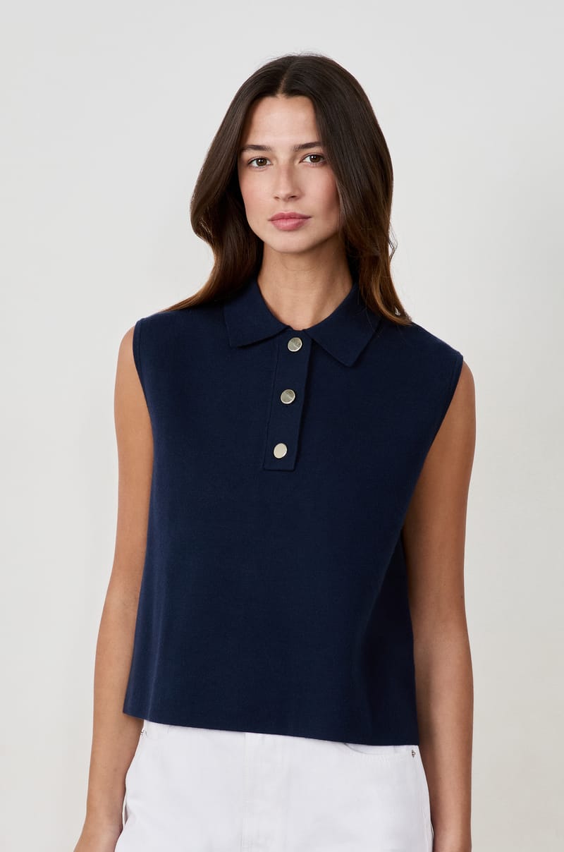 Essentiel du vestiaire, ce pull sans manches en maille fine est muni d'un col classique et d'une fermeture dotée de trois boutons métalliques. C'est un basique incontournable à porter seul ou en superposition.
