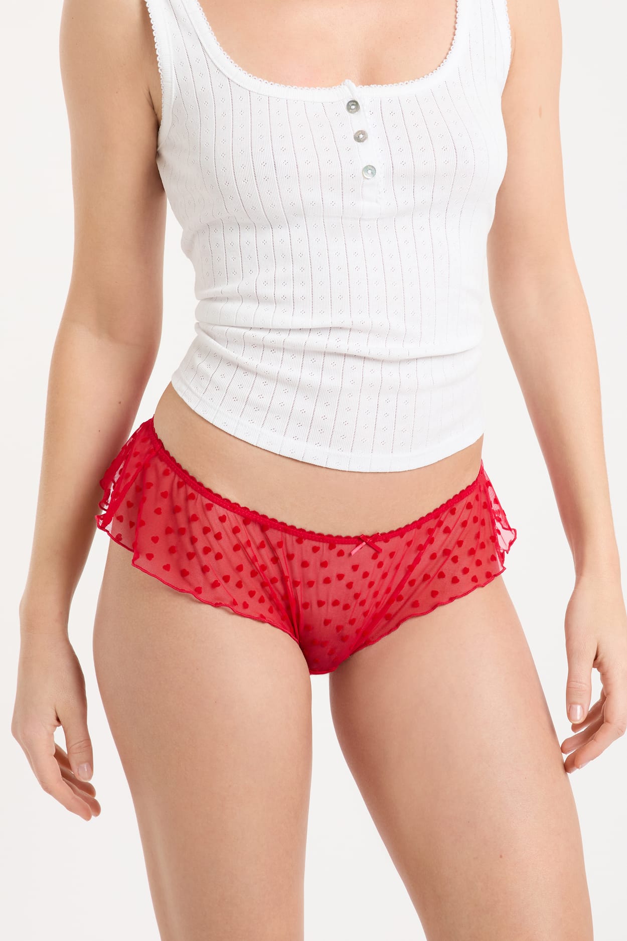 Confectionné en tulle délicatement transparent, ce hipster est muni de bords festonnés et d'un imprimé cœur floqué....