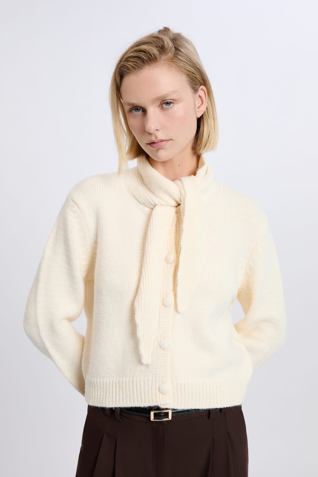 Gemaakt van tricot, dit vest heeft een knoopsluiting. Het onderscheidt zich door zijn kraag die vooraan gestrikt kan wor...